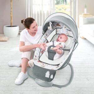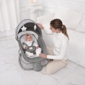 This description outlines the features of a high-tech, multifunctional baby cradle or rocking chair designed for safety, comfort, and convenience. Here’s a breakdown of its components and features: